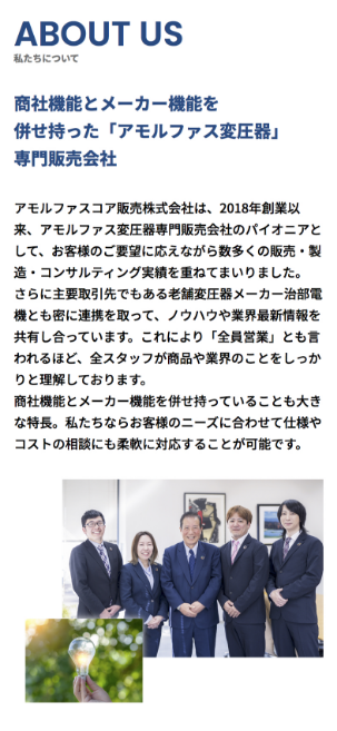 CORPORATE-SITEコーポレートサイト|アモルファスコア販売株式会社CLIENTアモルファスコアSOLUTIONSWEBPHOTOGRAPHY/MOVIEBRANDING VISIT WEBSITE PROJECT DIRECTORKENTO KITAGAWA PROJECT DIRECTORSHIHO MAYUMI WEB DESIGNERMIKU ITO LATEST WORKS CORPORATE-SITEコーポレートサイト|Beyond TsukijiWEB LP-SITELP|大川精螺工業株式会社WEB RECRUIT-SITE採用サイト|イケダガラス株式会社WEB 一覧へ戻る