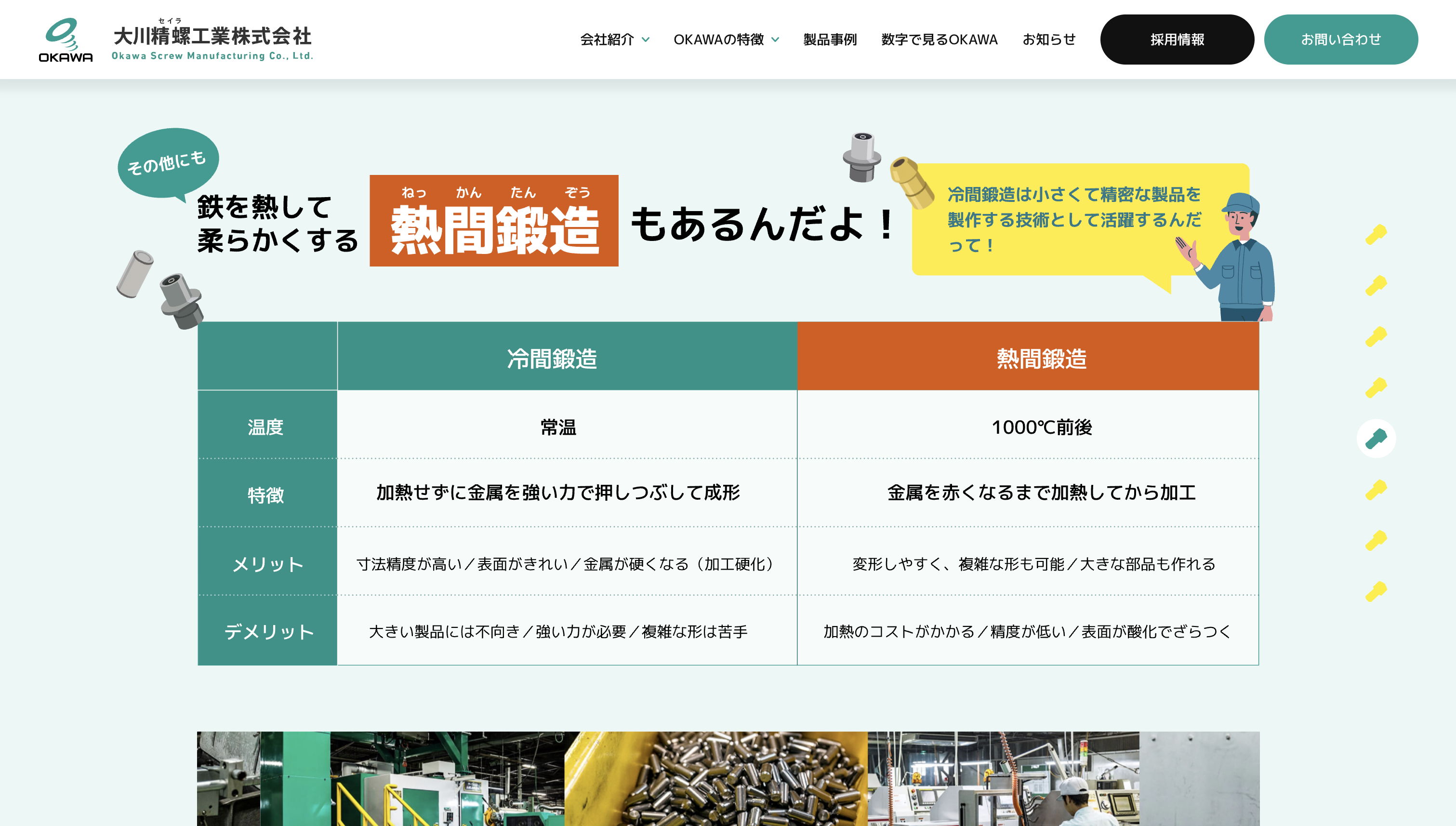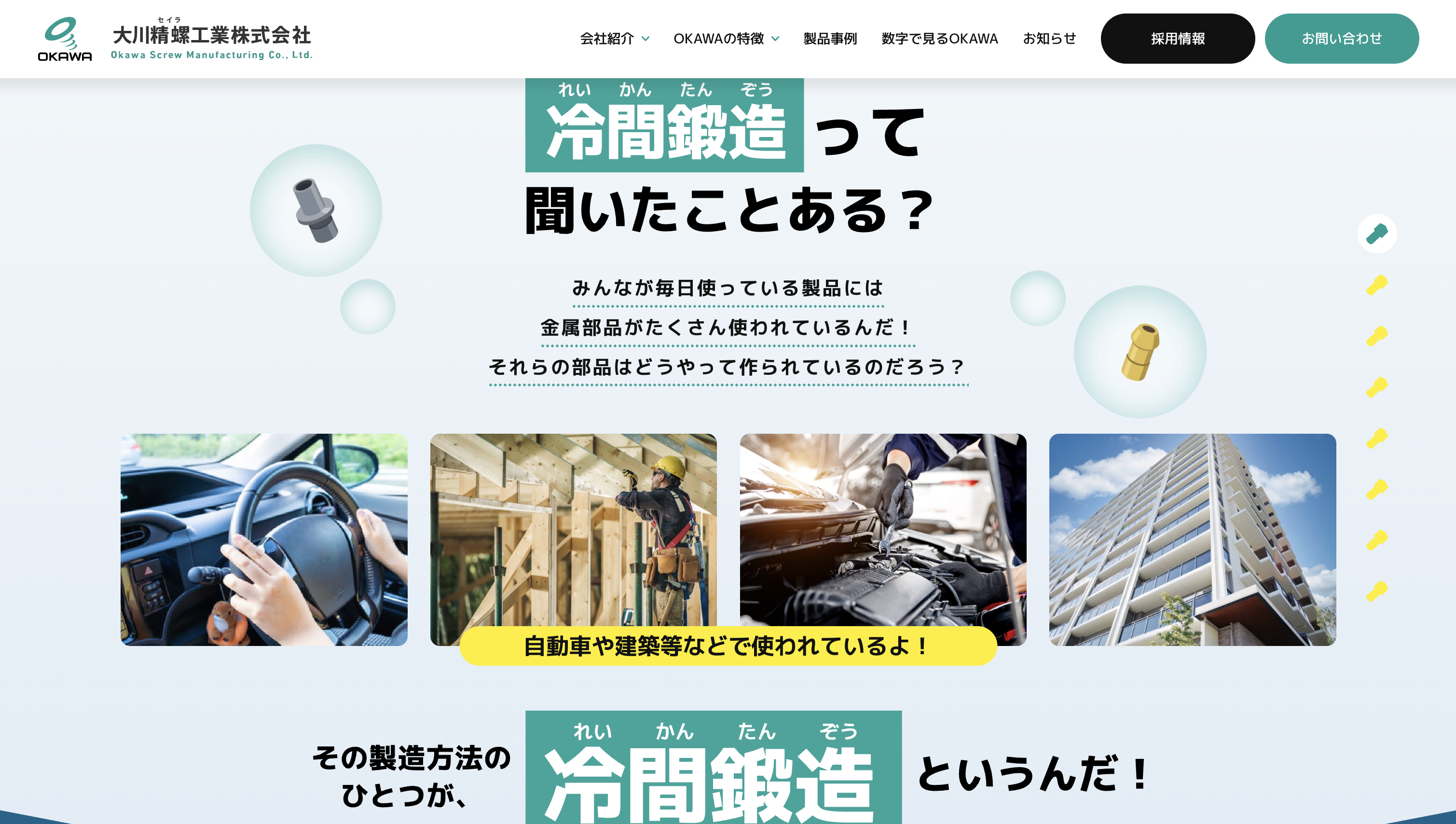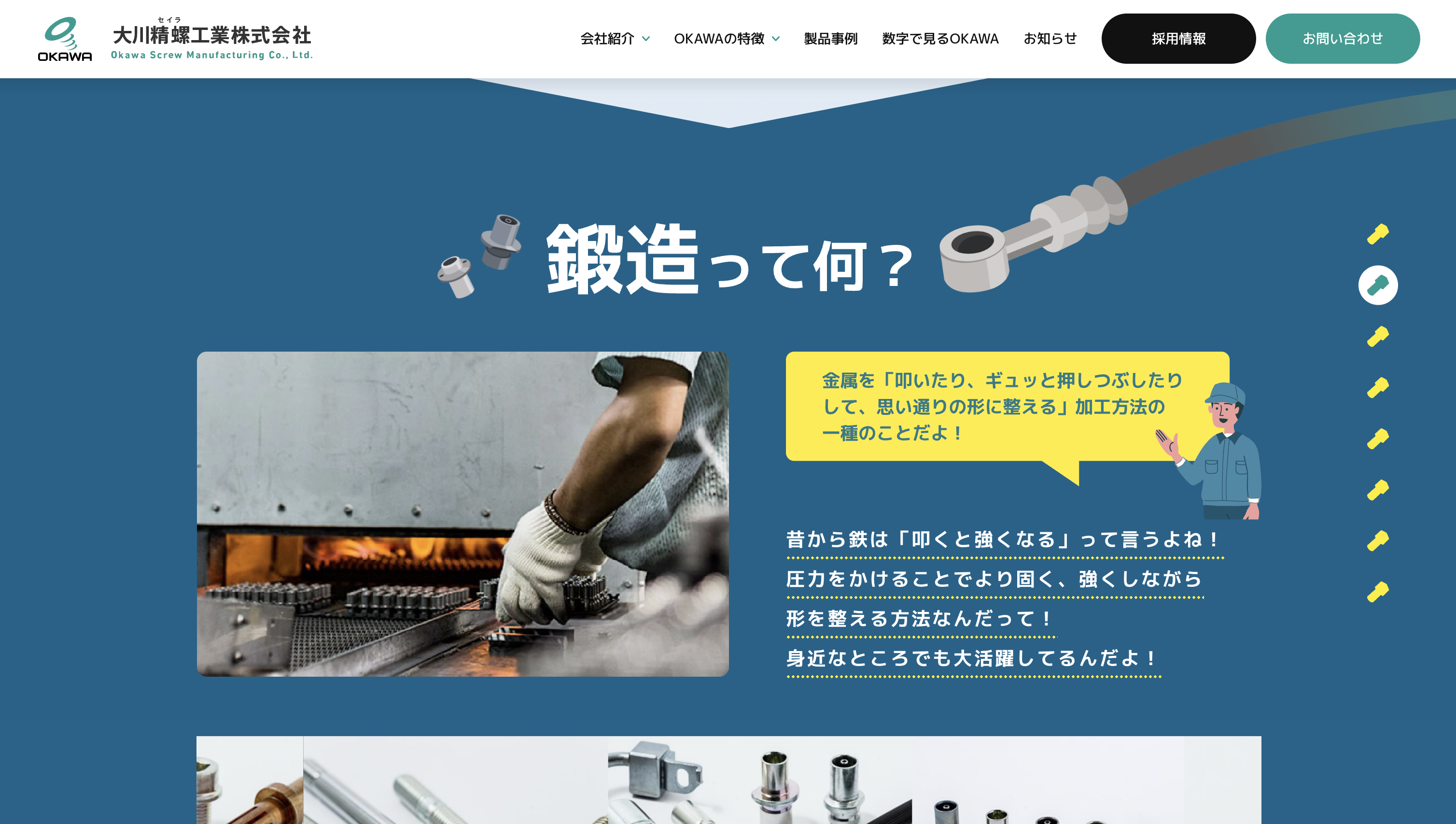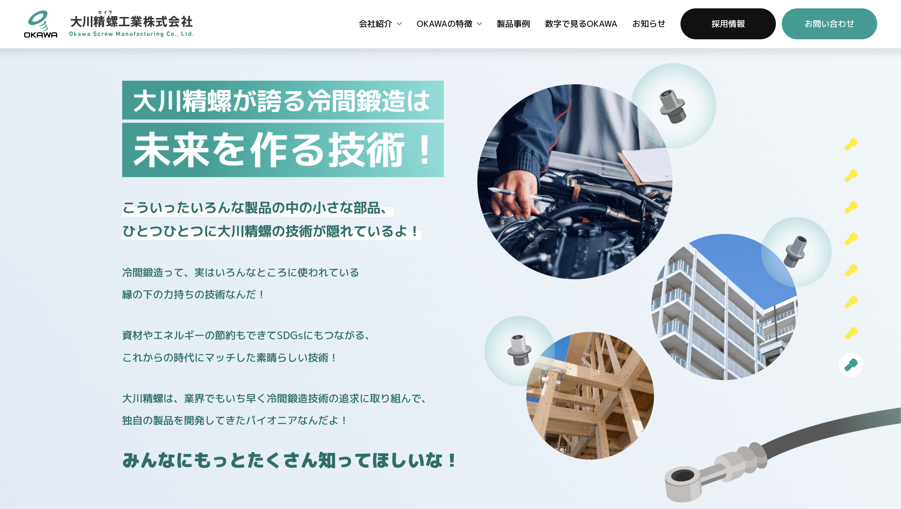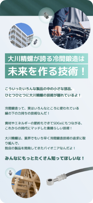 大川精螺工業株式会社様は、冷間鍛造技術を強みとし、自動車部品をはじめとした精密金属部品の製造を通じて、日本のものづくりを支えてきたメーカーです。長年にわたり培ってきた技術力と品質へのこだわりを大切にしながら、次世代を担う人材の採用にも力を入れています。