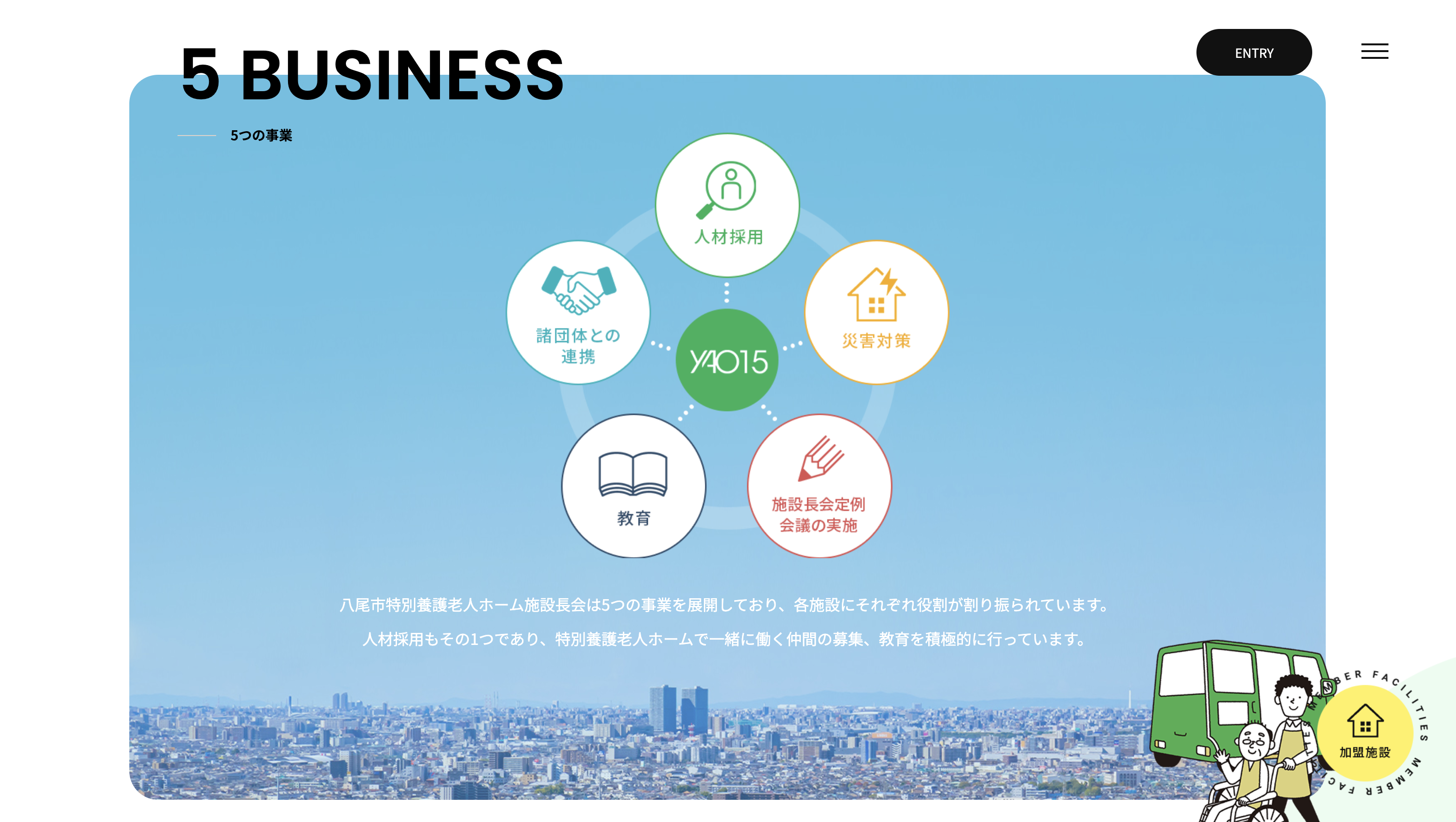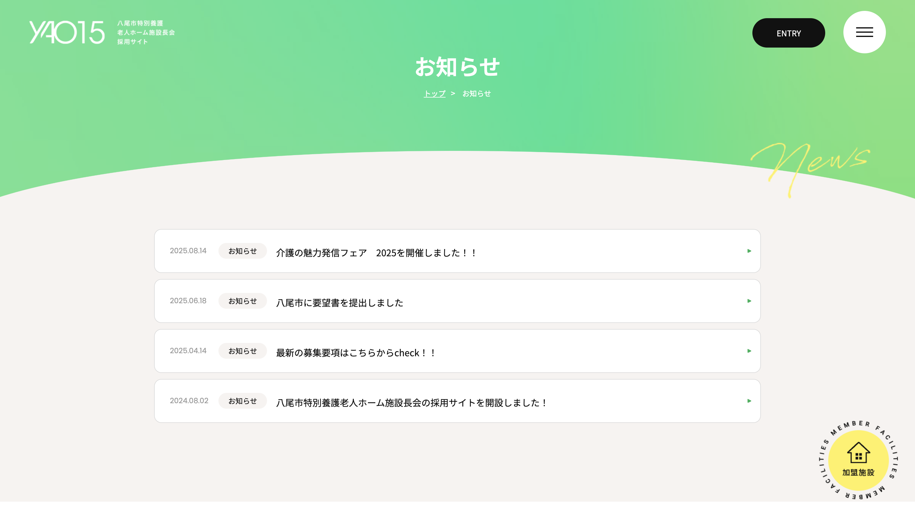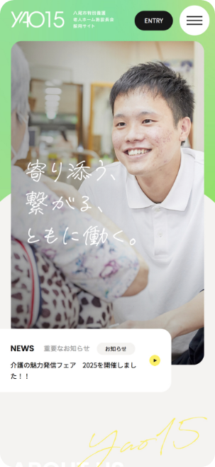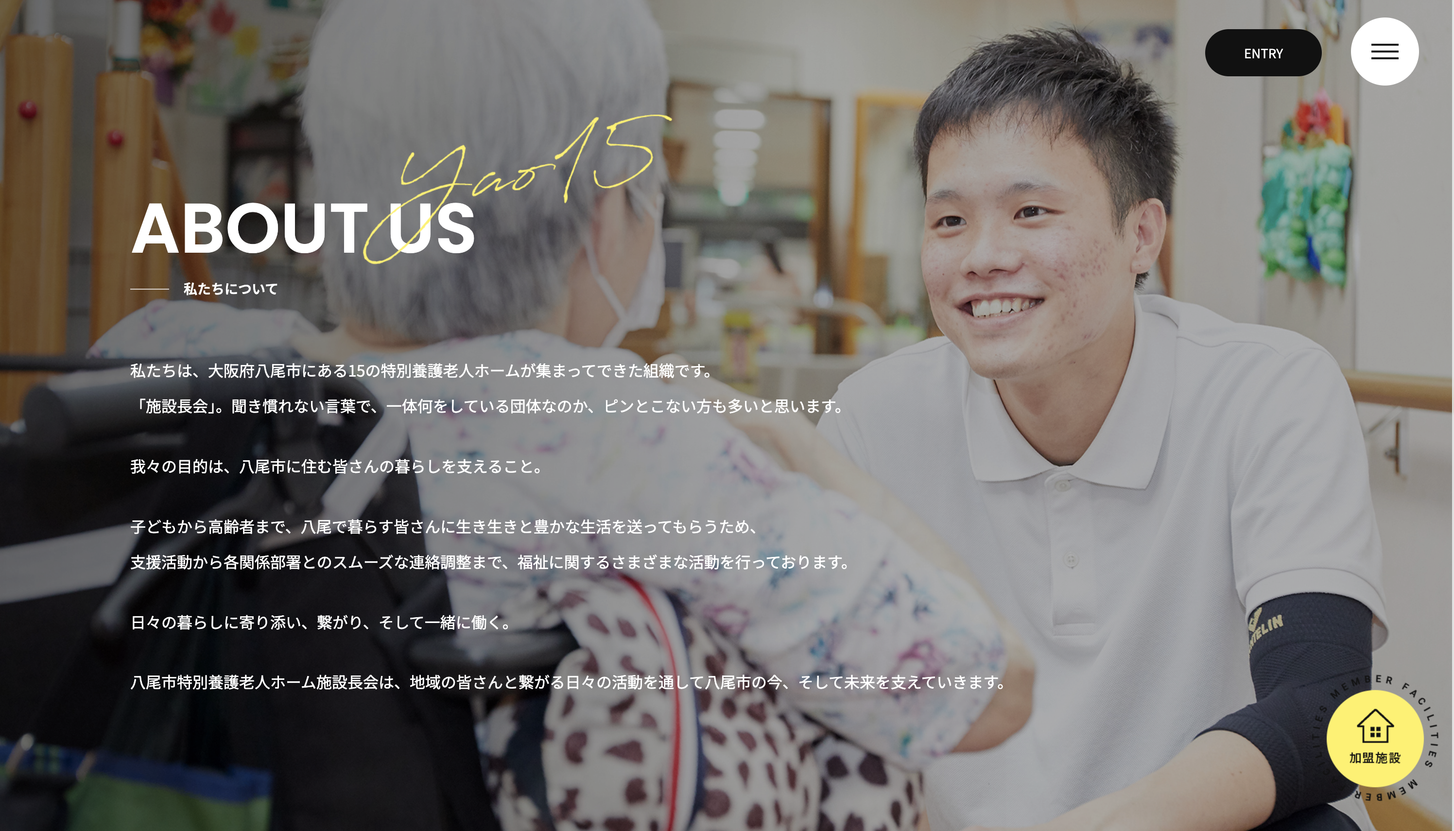 八尾市の特別養護老人ホーム15施設が所属する「施設長会」の活動内容の紹介と、各施設の採用情報を掲載するサイトを新規作成いたしました。