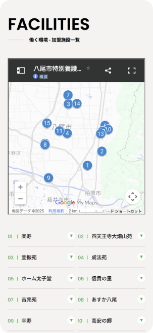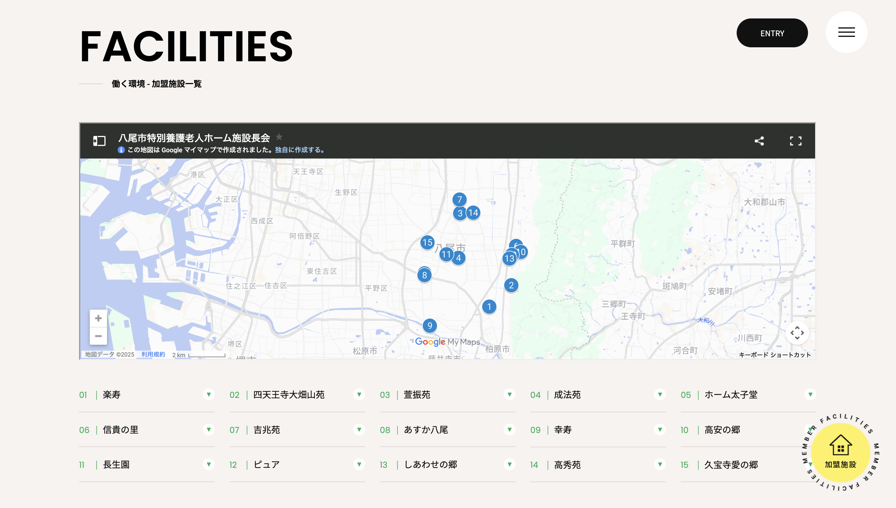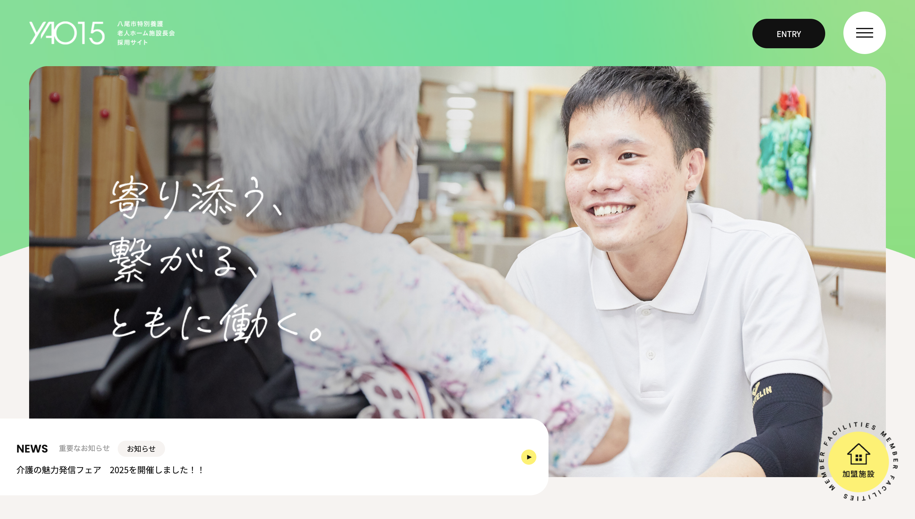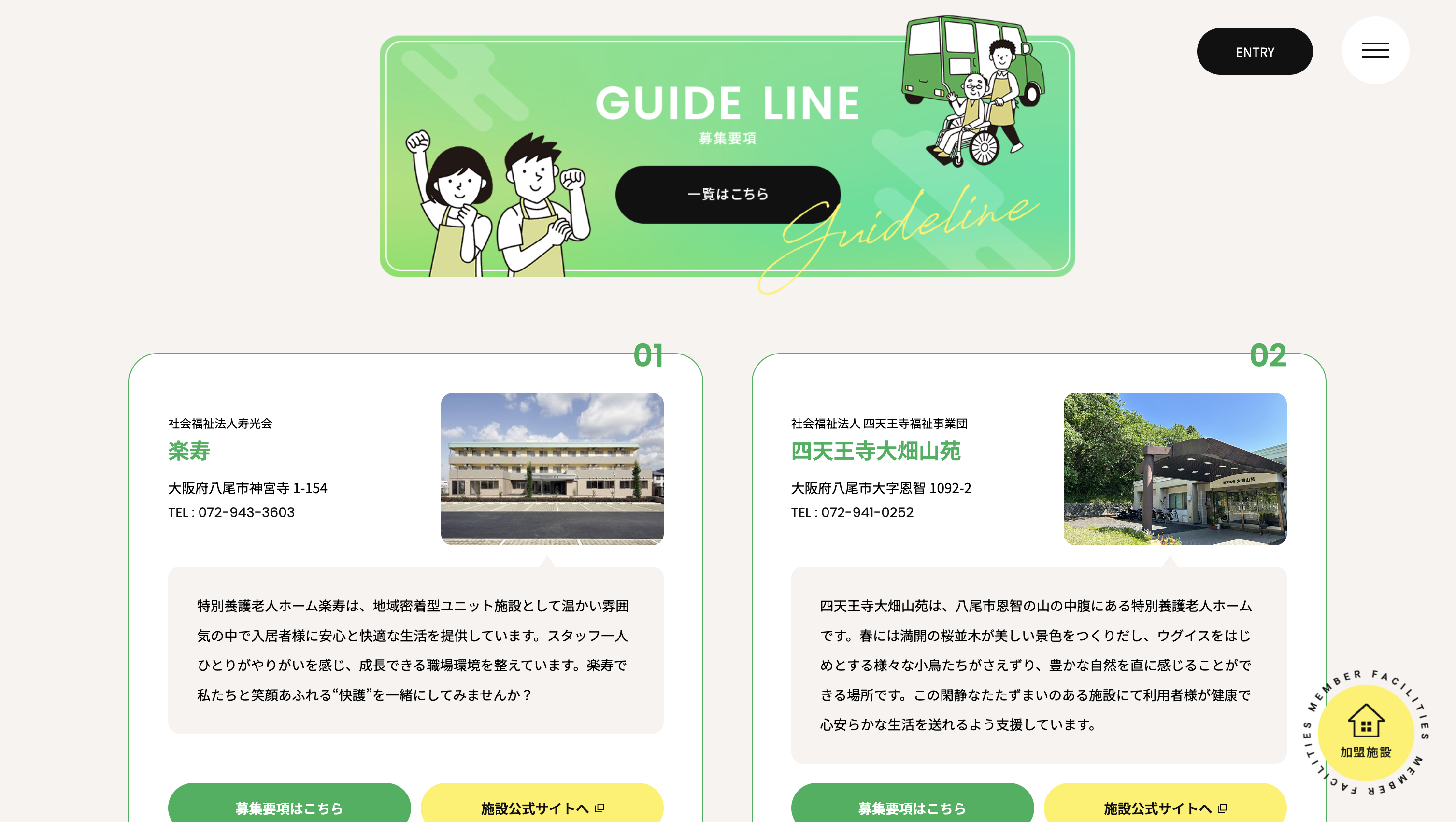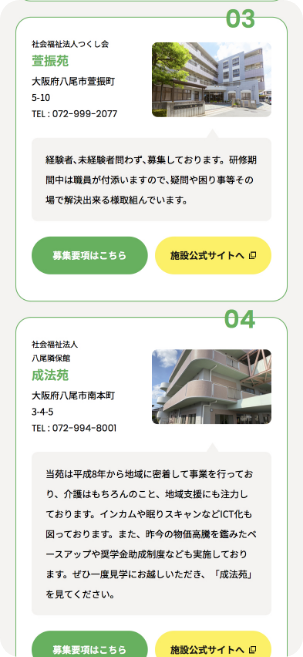 八尾市の特別養護老人ホーム15施設が所属する「施設長会」の活動内容の紹介と、各施設の採用情報を掲載するサイトを新規作成いたしました。