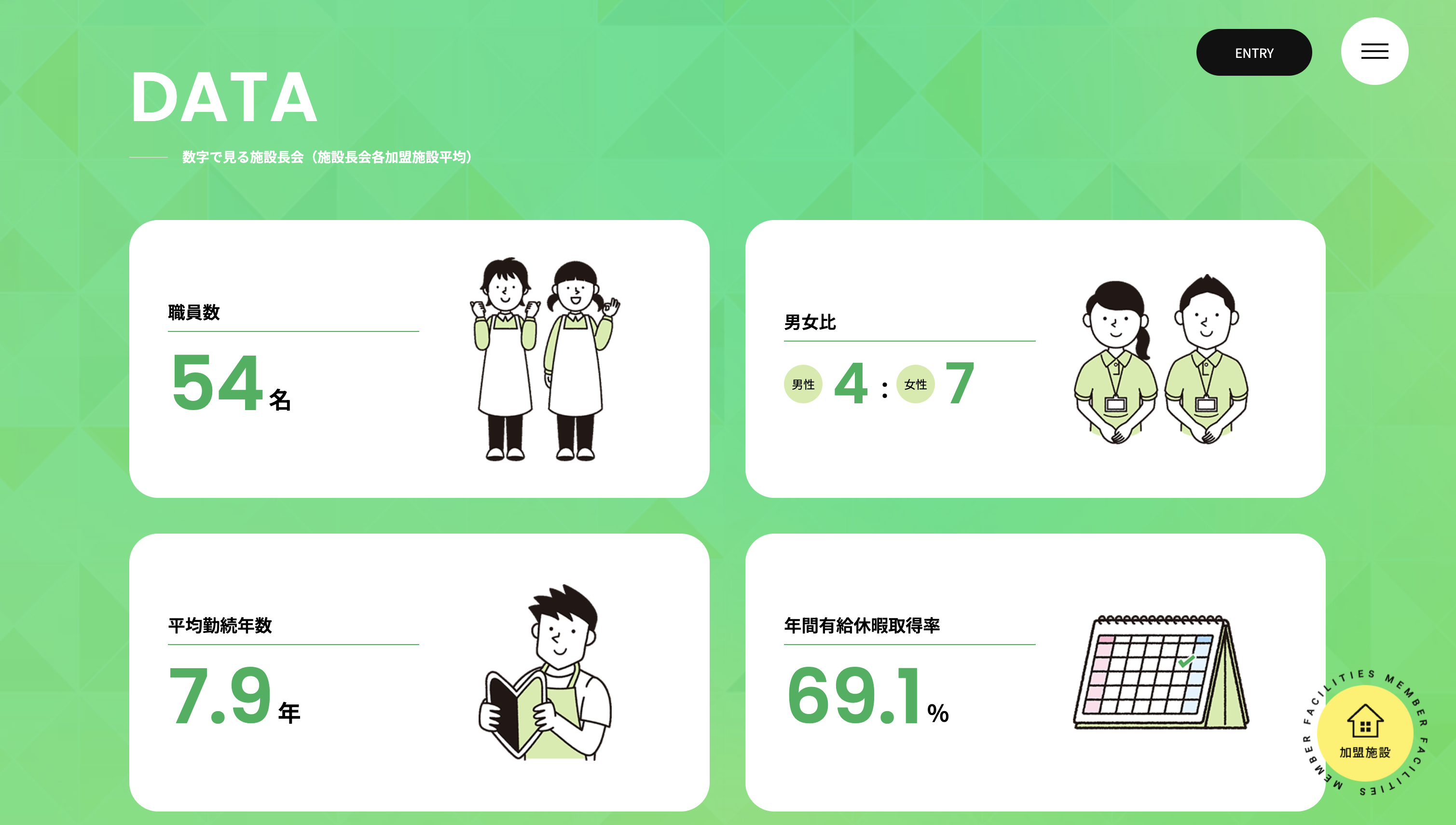 親しみやすさとクリーンなイメージを醸成するため、爽やかなグリーンを基調とし、可愛らしいイラストを随所に取り入れたデザインに仕上げています。